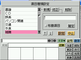 項目編集画面で、項目種類(あるいは支払種類)のボタンメニューにタッチするとプログラム異常が発生してしまいます。通常はありえないとは思うのですが、何らかの要因で項目種類、あるいは支払種類を格納しているファイルが壊れてしまったと思われます。お金持ち倶楽部を終了させた状態で、本体のMPFUTYPE.DAT(項目種類の場合)かMPFUFILE.DAT(支払種類の場合)を削除してみてください。項目種類あるいは支払種類がデフォルトに戻ってしまいますが、プログラム異常は発生しなくなるはずです。 |